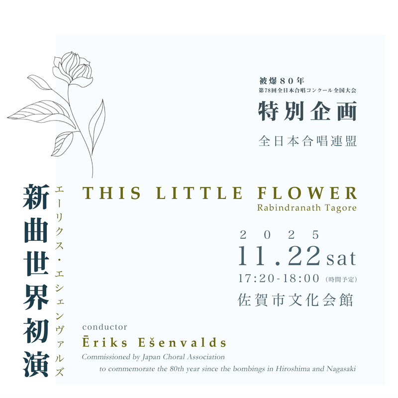 LITTLE FLOWER」がテキストに用いられた混声四部合唱曲です。カノン形式の3群で書かれ、エシェンヴァルズ色満載の壮大な響きが期待されます。