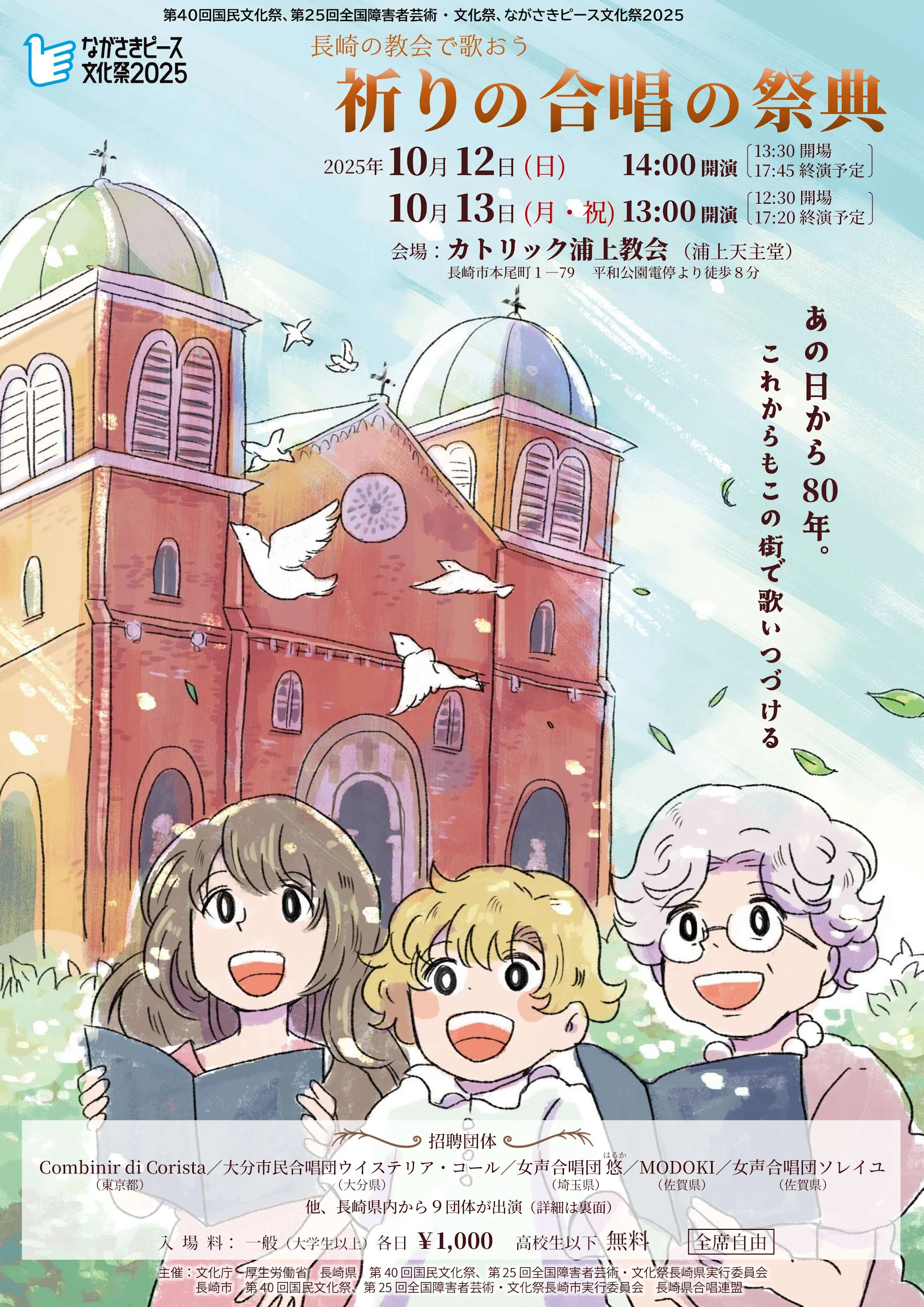 2025年10月12日(日)・13日(月・祝)に長崎県長崎市の浦上天主堂で開催される「ながさきピース文化祭2025「合唱の祭典」」のチラシを掲載しました。県内の小中高団体、一般団体ほか、県外からCombinir di Corista(東京)、大分市民合唱団ウイステリア・コール(大分)、女声合唱団 悠はるか(埼玉)、MODOKI(佐賀)、女声合唱団ソレイユ(佐賀)が招聘団体として出演します。