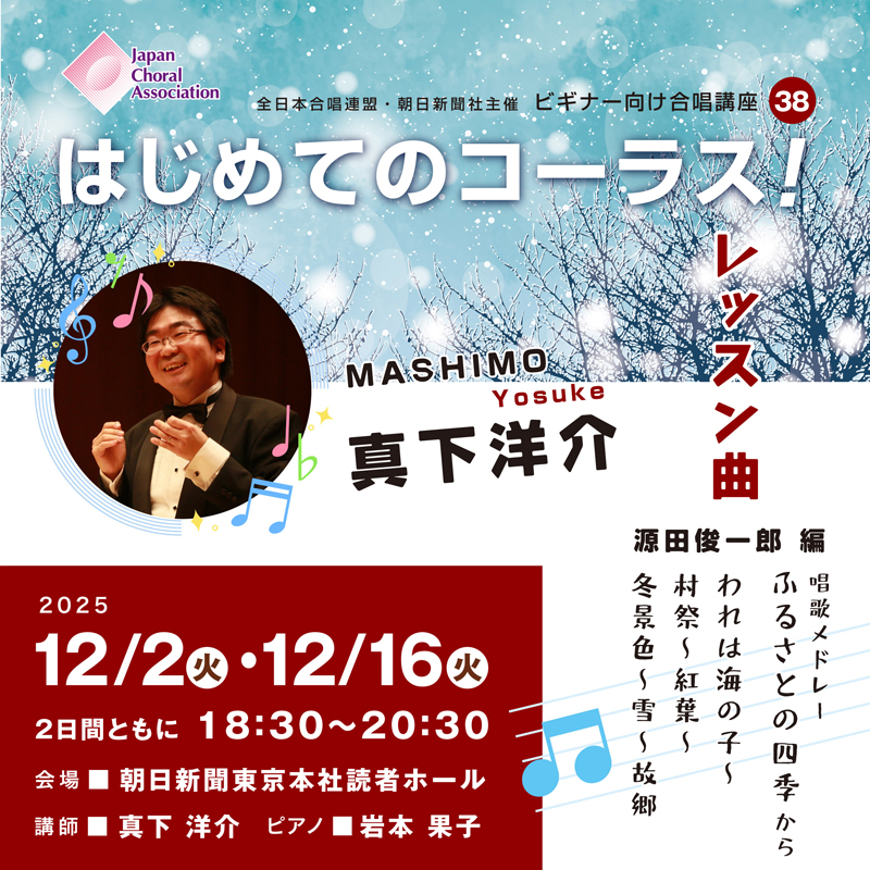 「はじめてのコーラス!」は合唱初体験のみなさんを対象とした合唱講座シリーズです。2025年度の講師は真下洋介先生。発声練習、ハーモニーの作り方などを学びながら、皆さんにとって親しみやすい練習曲を楽しく歌います。